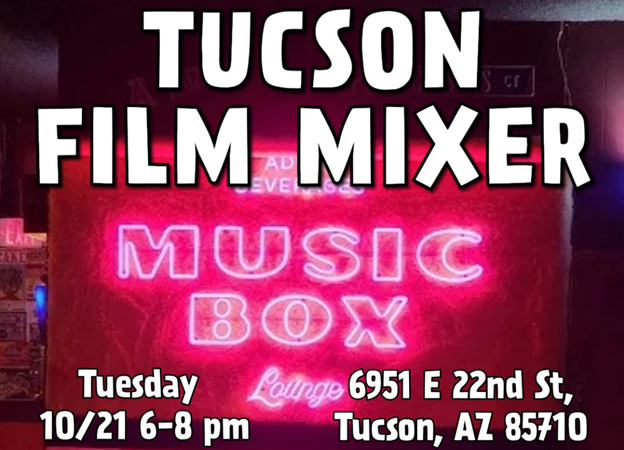 Join us for a fun night of networking with the film community! Tuesday, Oct. 21 from 6-8 pm. Music Box Lounge, 6951 E. 22nd St, Tucson. Free to attend & no RSVP needed! Enjoy food provided by @420_taco